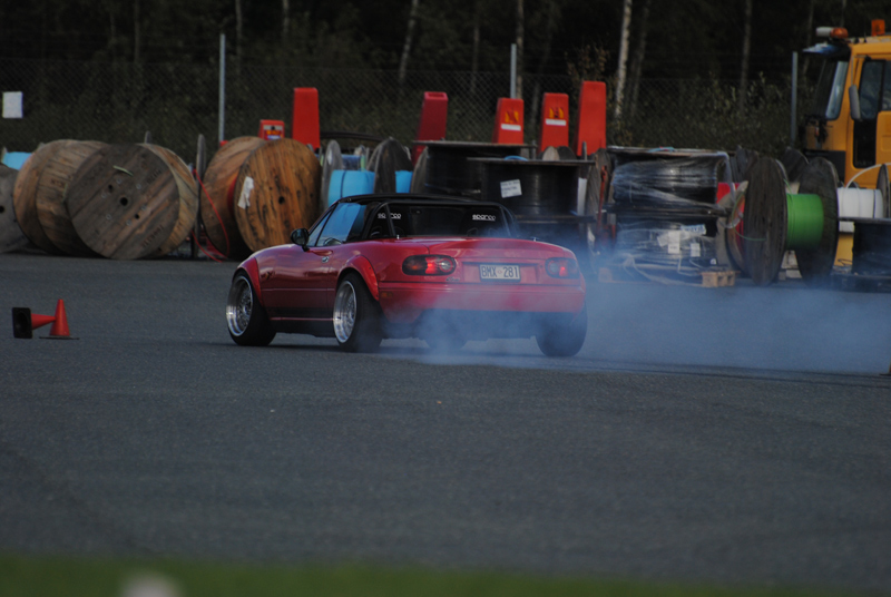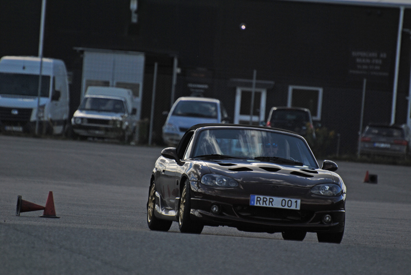 VÄRMEN MÅ HA DRAGIT I HANDBROMSEN MEN FÖR OSS GJORDE HÖSTEN ETT VÄLFÖRTJÄNT SLUT PÅ DEN STORM VID NAMN KNUD SOM HOTADE VÄSTSVERIGE OCH DET SLALOMSKA LUGNET OM SÖNDAGEN DÅ VI FIRADE SABBAT. Gammalt, både vad gäller bilpark och bekanta, och nytt. Och måhända var det de västlige vindarna som drog med sig en drös nya ansikten då de kommo från västerlandet med myrra och rökelse. Och snabba var de. Välkommen I - på det bästa. Mycket trevligt. Rickard Holtemark, Patrik Svärd, Kristian Larsson och Johannes Viktorsson är nu SSJ:are! Och snabbast (om man nu skulle få för sig att på något vis, så här mellan raderna påstå detta, var även det en västgöte: Claes Haglund, som vänder och vrider sin lilla Miata till efterföljd (där sådan vore möjlig) och gamman så det är en fröjd att skåda. Och lika snabb ä han på bana!