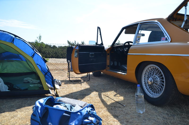 Närmare receptionen finns ännu ett litet tält, som mitt, inklämt mellan husbilarna, bredvid det står en mörk, danskregistrerad MGA. Han kommer bort till mig senare, som märkeskamrat och undrar över tänkbara MG-verkstäder, skulle något hända på vägen åt Stockholm. Han har aldrig varit i Sverige tidigare och han är närmare de sjuttio. Konstigt.