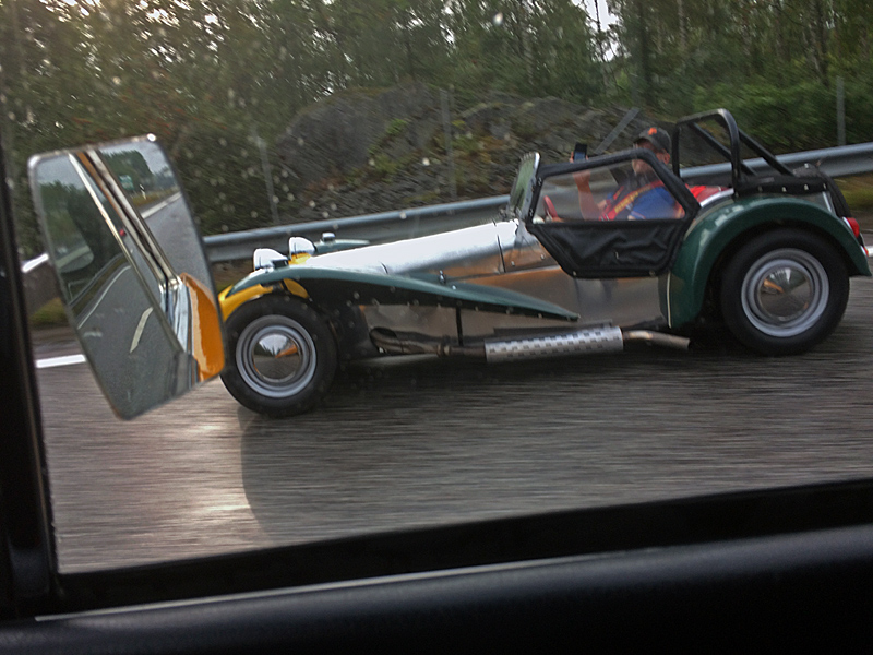 INTE ENS UNDER MANTORP NOSTALGIA RACING DAYS KUNDE ÅRETS SOMMAR BJUDA PÅ ETT VÄDER AV TYPEN "ALLDELES FÖR JÄVLA VARMT". Det har det gjort förr, det minns jag bestämt. Vi satte av från Jönnet vid 07.15 i ett ganska sirligt regn. Natten hade dragit fram med väldiga regnavsläpp och nu stod vi, för tillfället under tanktak och log lite milt åt Loftis enastående små torkarblad på Lotusen. "Ju fortare vi kör desto bättre. Då klarar jag mig undan väta. Å andra sidan trivs bilen bäst i 80-90 i marschfart". Så nånstans där vi fick hålla oss, på Riksettan, till Gränna, sedan blev det för puttenuttit och tidskrävande - våra SSJ:are skulle ut och kriga startpositioner redan vid nio nollnoll - så vi äntrade E4:an och 120 kilometerstempo.