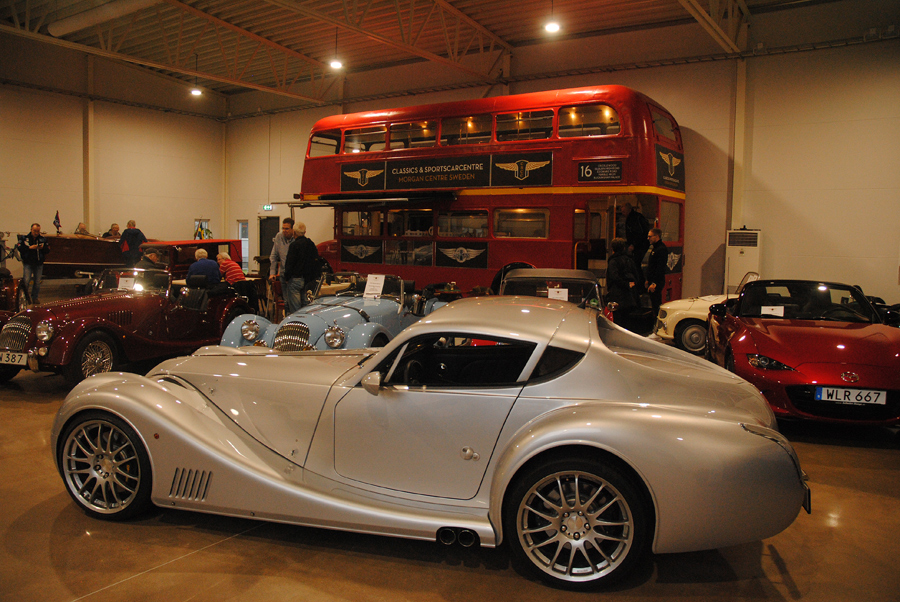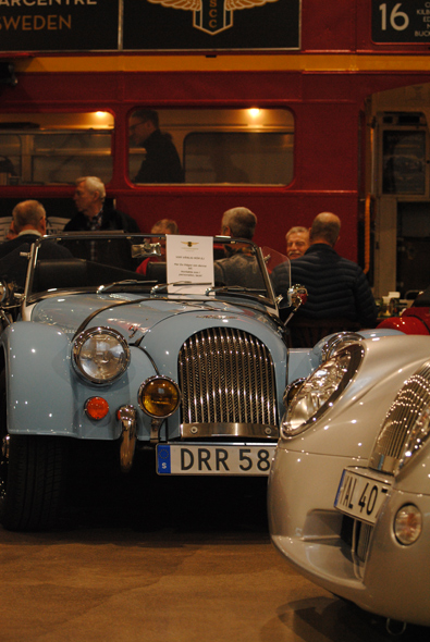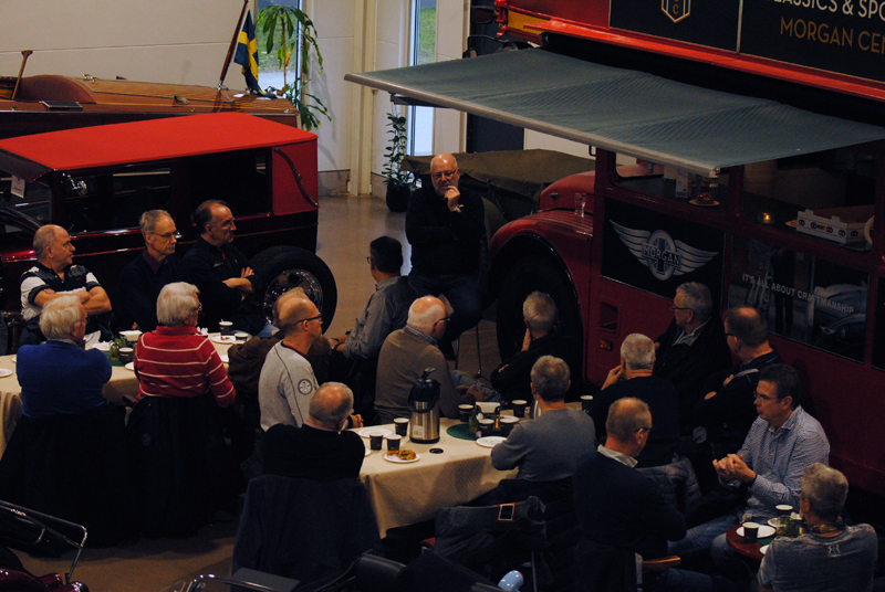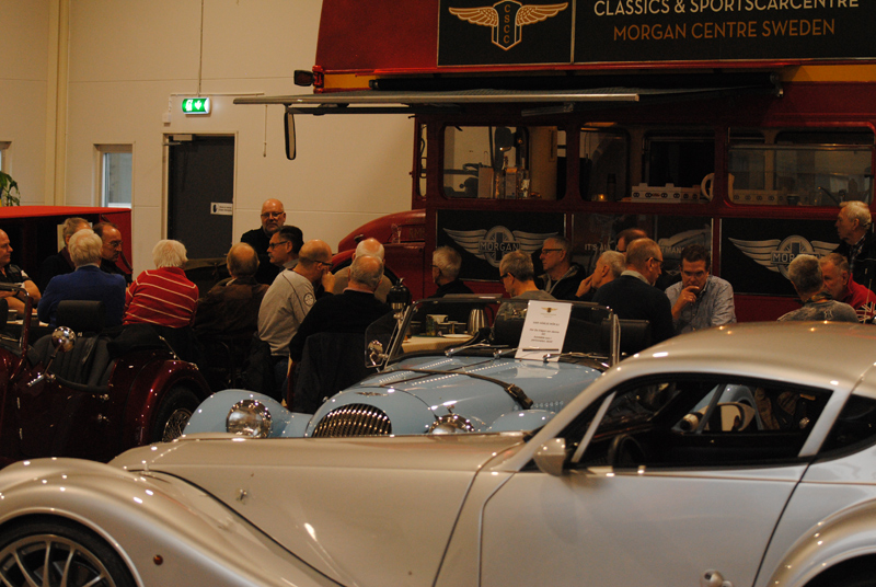 För oss som var på plats, 30 plus, berättade Lasse om Morgans historia och framtid, om företaget här i Vetlanda och avlivade några seglivade myter på vägen, som den om att Morganbilar skulle ha eller ha haft träram. Detta fick vi oss till livs tillsammans med mackor och kaffe innan vi strosade runt bland trehjulingar, småhjulingar och mer normalhjulade.