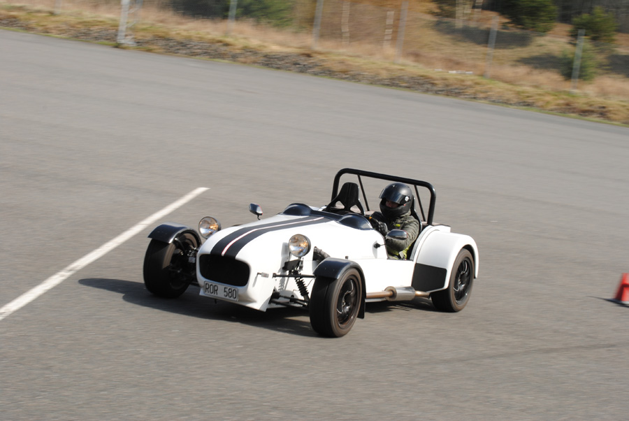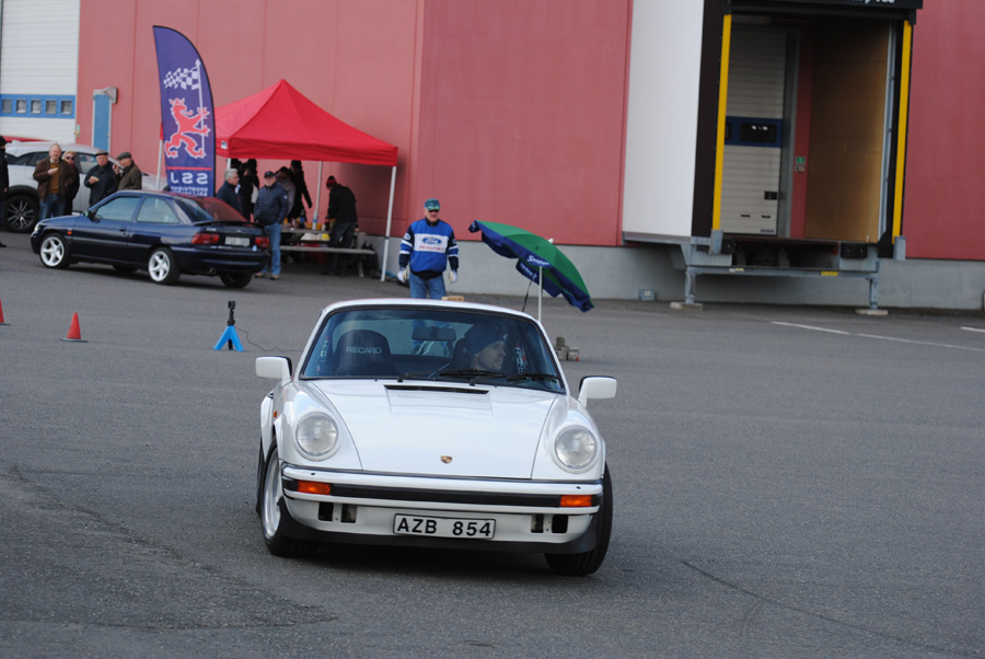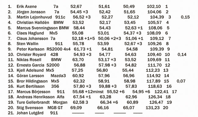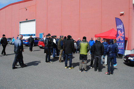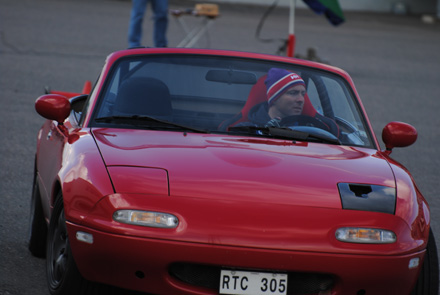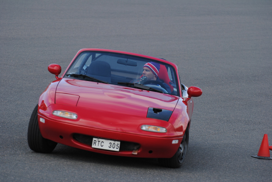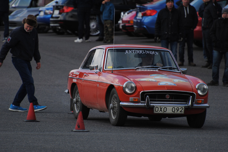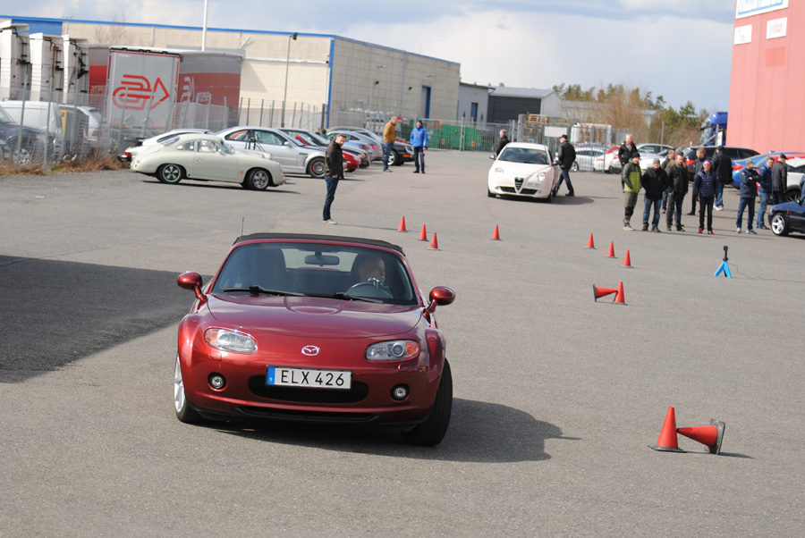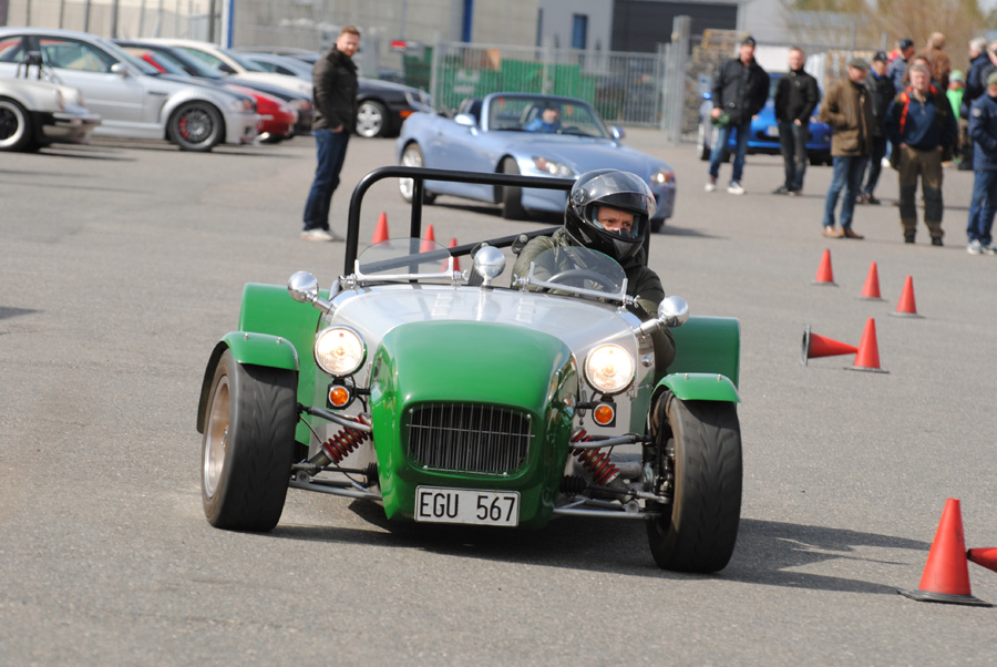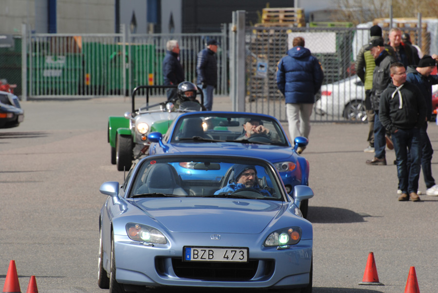 DET TALADES OM KRAFTIG BLÅST, FEM GRADER, REGN, JA TILL OCH MED SNÖ OCH RISK FÖR ÅSKA. DET BLEV SEX OCH SOL, OCH DET ÄR EN BRA KOMBINATION. Med tanke på prognoserna trodde vi på en något tunn samling bilar och människor, men begäret har legat vilande och bara väntat på att få eruptera. På annat vis kan inte de dryga tjugo bilarna som attackerade konorna och de dryga tio till som samlades, tolkas. Allt från ekerhjul till kolfiberhuvar. Det bjöds på korv, kaffe och läskeblask och det tävlades om mängder av fina priser skänkta av Mekonomen Flygfältet och Mekonomen Ekhagen, Biltema, AB Bildelar/ADbildelar, Folkets Park och Christer Royard. Tack också till Claesson Transport för asfaltsplanen på vilken Peter och Christer lagt en alldeles förträfflig slalomslinga. Erik, Jörgen och Martin snabbast, Bror, Christer och Martin jämnast - utförlig resultatlista nedan. Och på onsdag bär det av till Värmland och på torsdag är det besök på Mr Cap.